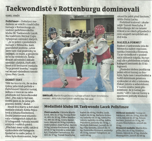 Baví mě sportovat. S oddílem TKD Lacek se účastním závodů v ČR i po celé Evropě. Tam svými úspěchy propagujeme tento sport. Ve škole získávám ke sportování další spolužáky i děti z MŠ. Návštěva oddílu v naší škole byla pro všechny nejen překvapením, ale i pobídkou ke sportování. Únor - v Německu jsem vybojoval zlatou medaili. Březen- trénuji doma sám,pomáhám šít roušky. Duben - tréninkem si stále udržuji kondici pro závody. Květen - ještě trénuju sám doma. Od 26.5 konečně na tréninku s oddílem.