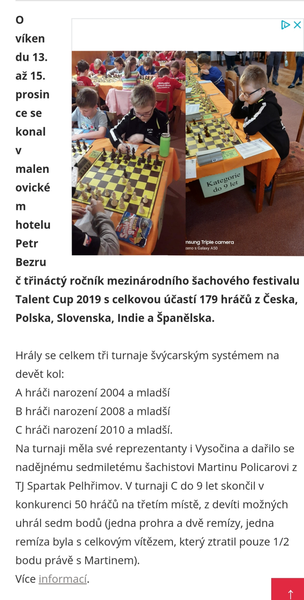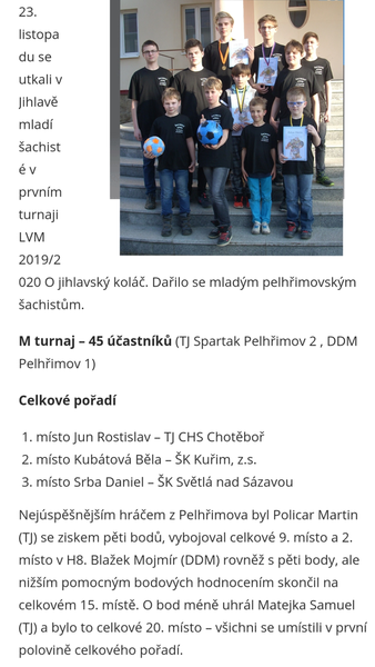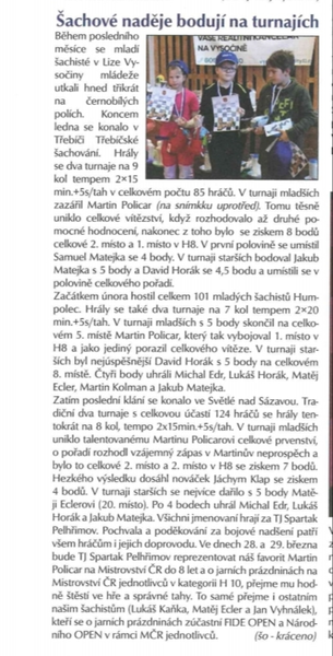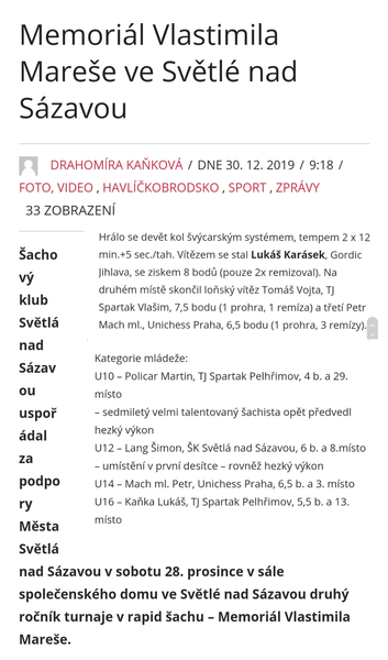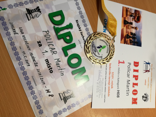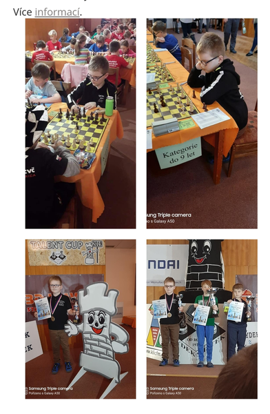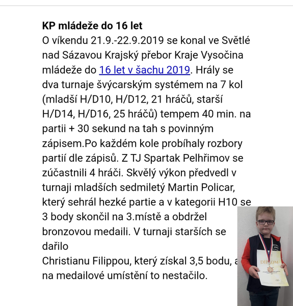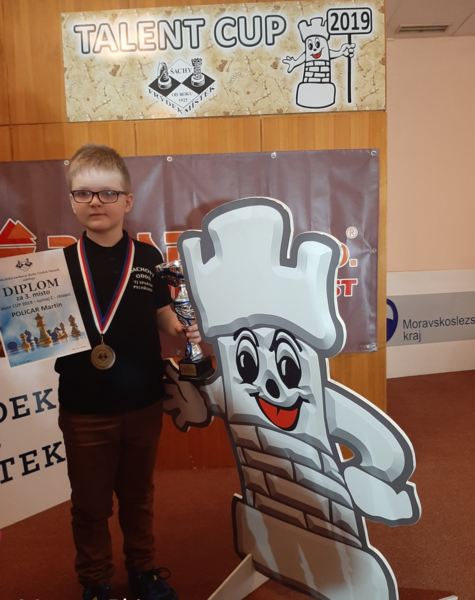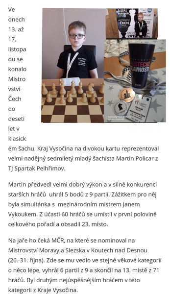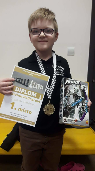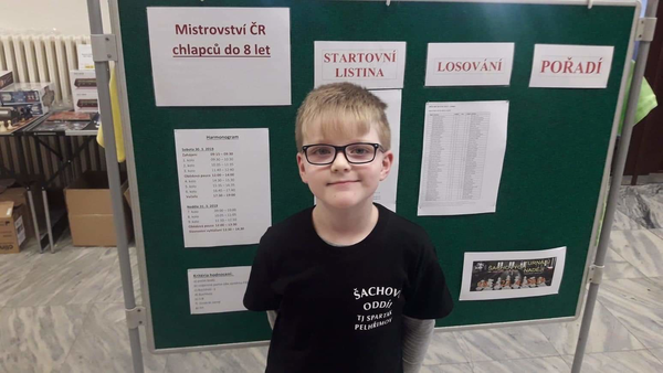 Je mi 7 roků.Šachy mám moc rád. Baví mě logické myšlení a šachy mi to nabízejí.Motivací je pro mě každá dobře odehraná partie.Odměnou potom vítězství v turnajích a pochvala od rodičů a trenérů.Hraji od 4 let,2 roky za TJ Spartak Pelhřimov.Šachy jsou sport,který je náročný na soustředění a přemýšlení,bez dobré fyzické kondice nelze odehrát i čtyři hodiny dlouhou partii.Rád proto plavu,běhám, jezdím na kole, to vše mi pomáhá dosáhnout dobré výsledky, např. nominaci na MČR 10letých.